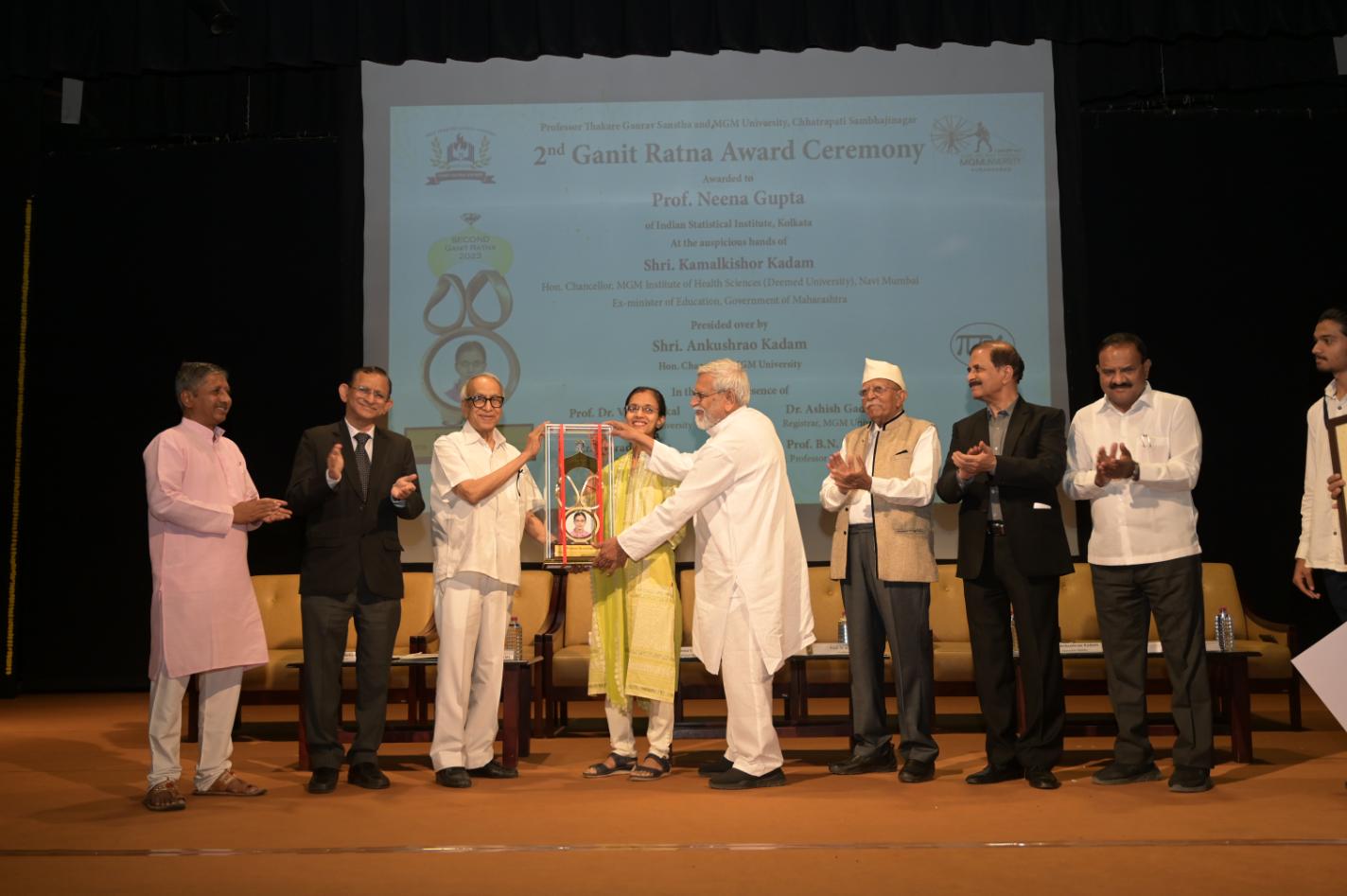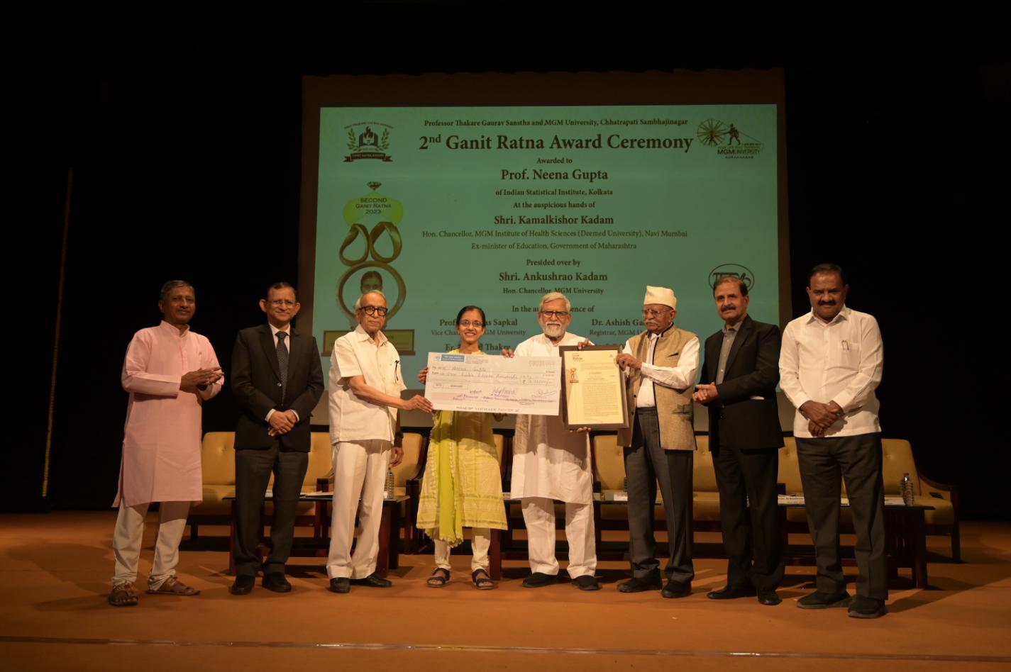 MGM University and Professor Thakare Gaurav Sanstha jointly organized Second Ganit Ratna Award Ceremony. The details are as follows. The Second Ganit Ratna Award was conferred on Prof. Neena Gupta at the auspicious hands of Shri. Kamal Kishor Kadam (Ex-Minister of education, Govt. of Maharashtra, Hon. Chancellor of MGM University (Deemed) of Health Sciences, Navi Mumbai). This award shall be given in the presence of Shri Ankushraoji Kadam (Hon. Chancellor of MGM University, Aurangabad), Shri Satishaji Chavan (M.L.C. and Secretary Marathwada ShikshanPrasarak Mandal), Er Sharadji Thakre (managing director of Laxmi Hydraulics Pvt. Ltd, Solapur), Prof. Vilas Sapakal (Vice Chancellor of MGM University), Dr Ashish Gadekar (Registrar) and trustees of PTGS and Mahatma Gandhi Mission.